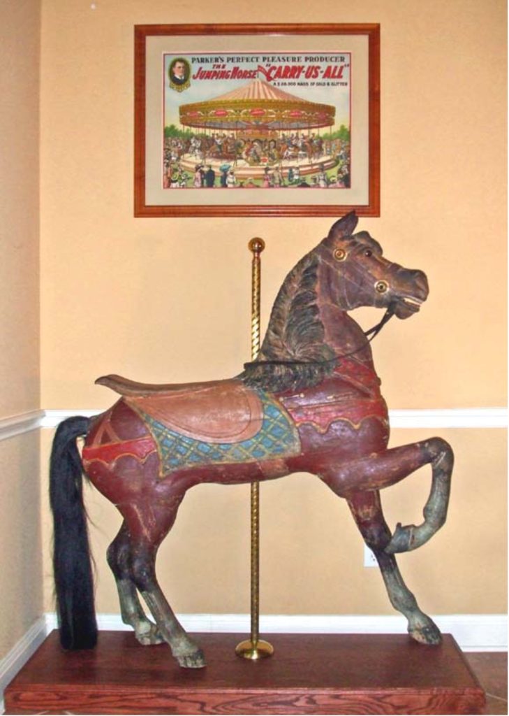 Bill Benjamin had obtained “Mascot, an early Looff Stander.” Was this merry-go-round horse, which had been severely charred in a house fire, one of those many hand- carved pieces made by Charles Looff? With utmost care and patience Bill removed Mascot’s burned exterior and coats of paint down to his original beautiful coat. Now came many questions. How old was Mascot? Who did make him? When and where did Mascot receive riders?