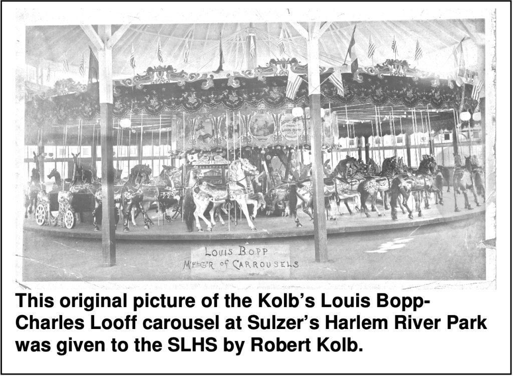 Mascot’s biography now began in earnest. Robert Kolb’s brother, Henry (Hank), provided Bill with information that “the Louis Bopp-manufactured carousel began its life at Sulzer’s Harlem River Park, New York City. Following the refurbishing and conversion of the stationary carousel, to include jumpers on alternating 2nd and 3rd rows, the Kolbs relocated the carousel in 1908 to New Rensselaer Park in the Lansingburgh section of Troy.