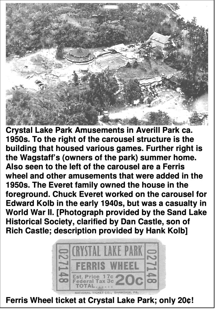 “The Kolb/Bopp carousel remained at Crystal Lake Park until 1960 when according to The Troy Record article, it was moved by U-Haul truck to Crescent, 20 miles northwest of Averill Park”.
