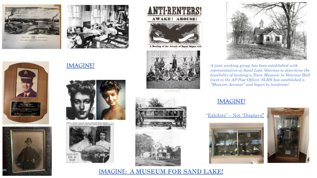 In 2025, the Sand Lake Historical Society celebrated its 50th anniversary. Since its inception there has been a long-standing discussion about establishing a physical museum to educate and share our town’s rich history. This dream is finally becoming a reality as the Historical Society collaborates with the Veterans of Sand Lake to create a History Museum on the ground floor of the historic Sand Lake Veterans Hall.