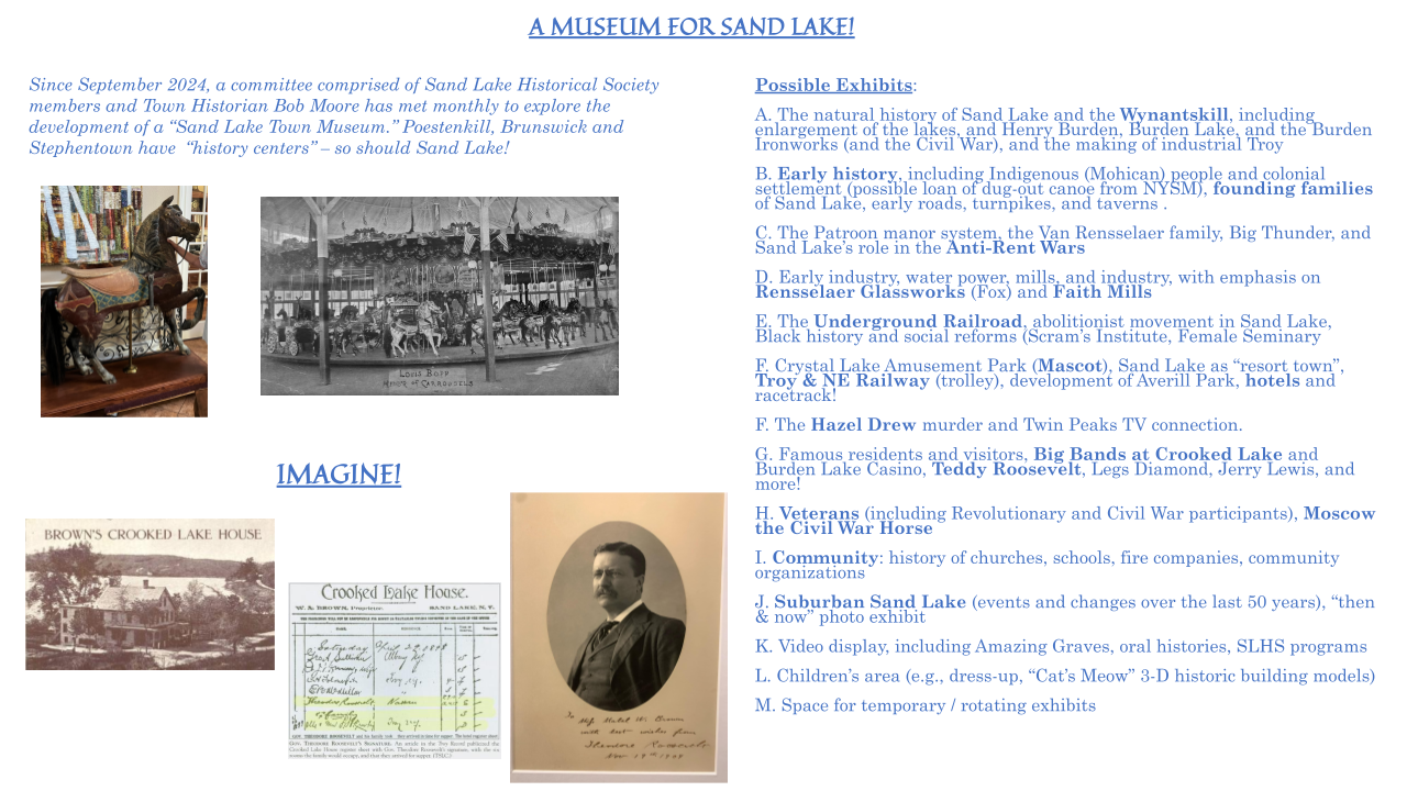 The town of Sand Lake and its surrounding region are steeped in history, and both the town and the Historical Society possess a vast collection of historical artifacts that deserve to be shared with our community and with future generations. From Military-related items like Moscow, the Civil War horse, to historic guests like Teddy Roosevelt at our hotels, mills along the Wynantskill, amusement venues featuring Mascot the carousel horse, and even an unsolved murder mystery, there’s a wealth of historical stories waiting to be told.